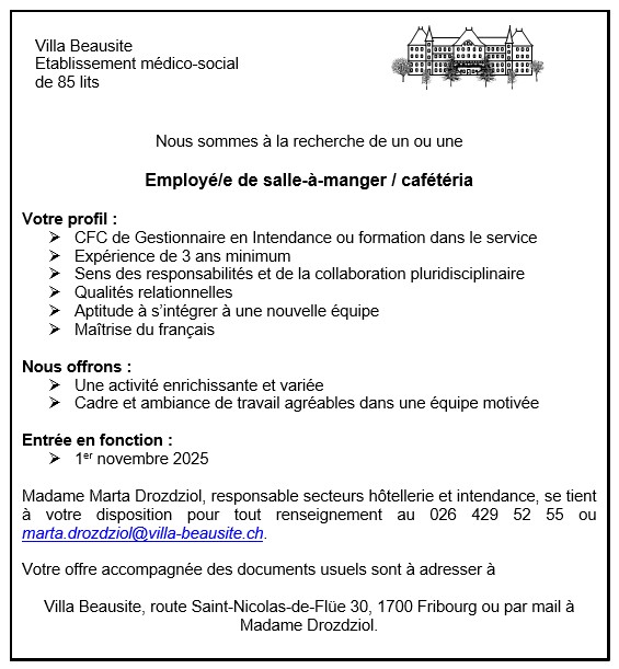 Pour tout renseignement, veuillez vous adresser au 026 429 52 52 ou par mail à info@villa-beausite.ch